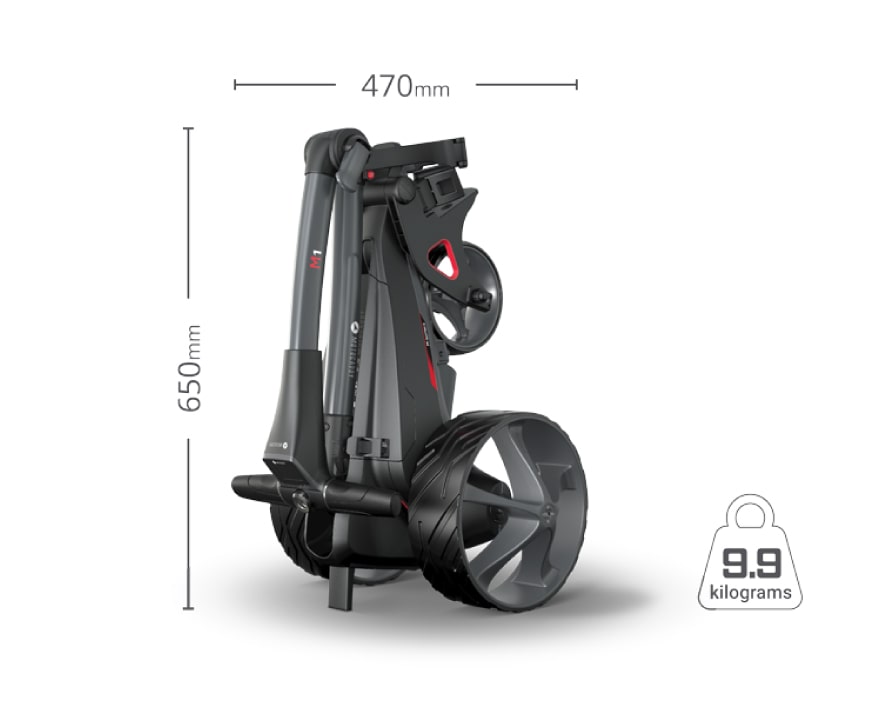 The Motocaddy M1 features the latest M-Series frame with a compact folded design, ideal for golfers who need to maximize space when transporting their trolley.